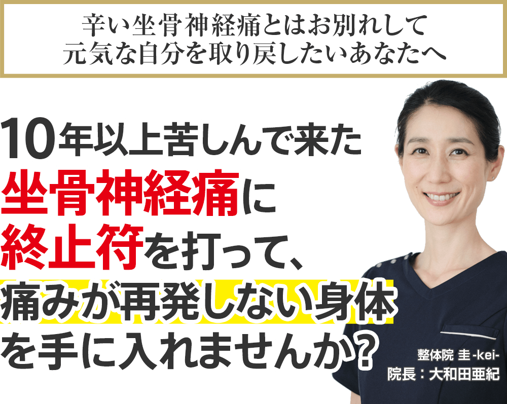 女性専用整体院圭keiで、あなたの根本の要因に対しての施術を行い、坐骨神経痛の不安から解消され、もう二度とその慢性坐骨神経痛を我慢することのない人生を手に入れる道。